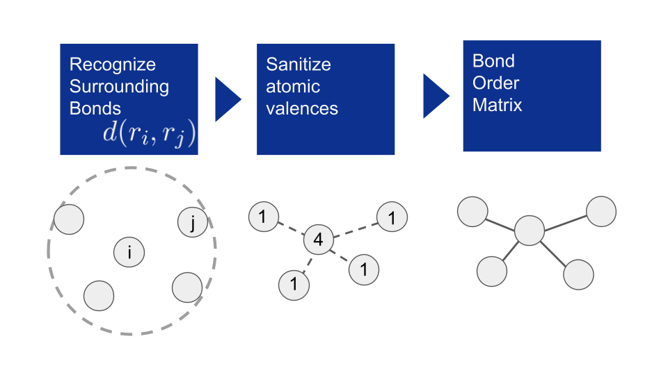 まずは既存の手法であるルールベースの結合次数決定手法について説明します。この方法はRDKitのrdDetermineBondsに実装されており、本研究ではrdDetermineBondsを周期境界条件に対応させたコードを実装して使用しました。ルールベース手法ではまず原子間距離に基づいて、原子種ごとに決められた閾値以内の原子同士を結びます。そしてすべての原子の価数が満たされるように事前に設定された電荷などを考慮しながら結合次数を決定します。ここで重要であることは、閾値以下の結合のみを認識しているということです。