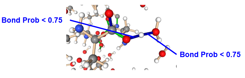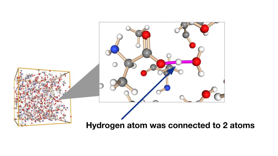このルールベースの手法は安定な構造 (平衡構造) 付近では結合次数の決定ができるものの、化学反応が起きているような一部が不安定となっている構造の場合に結合次数の推定に失敗することがあります。以下にその一例を示します。図中の構造はアラニン水溶液であり、stickは閾値以内の原子を結んだ結果です。中心に存在するアラニン分子と水分子で水素原子が移動していますが、このような場合に水素原子から水分子の酸素とカルボキシル基の酸素の両方に結合が形成されていることが分かります。水素の価数は中性の場合1であるため、ルールベース手法は整合性のとれた結合次数を決定できず、古典力場に必要な結合の情報を出力することができません