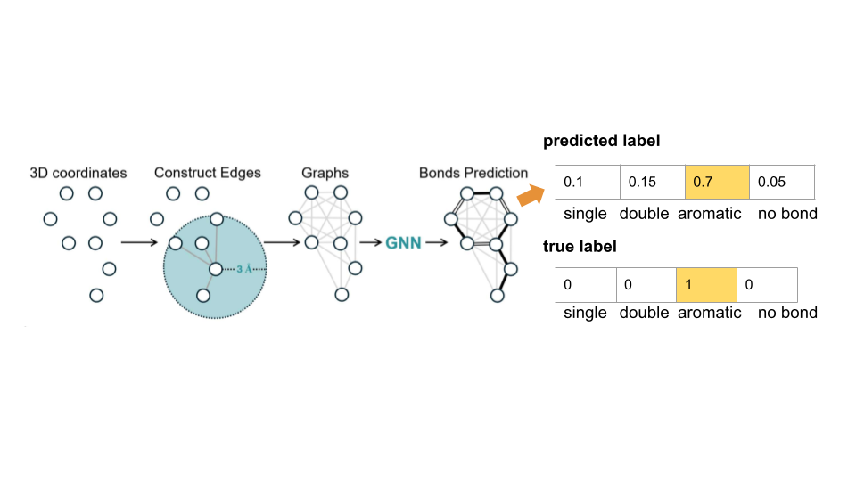 今後の改善点としてはモデルのアーキテクチャについて、先行研究ではカットオフ半径が\(\scriptsize 3.0\ \mathrm{Å}\)であり、これは高々2つ先の結合までしかモデルに見えていないことになります。今後はカットオフ半径を広げることによって共役結合など長距離の情報が重要となる結合推定の精度を向上させることができると期待されます。最後に結合次数の決定に関して、複数の構造の中から結合次数の同時確率が最大となる割り当てを採用するなどが考えられるほか、MDトラジェクトリの時系列データを利用した推論[4]なども有望であると思います。