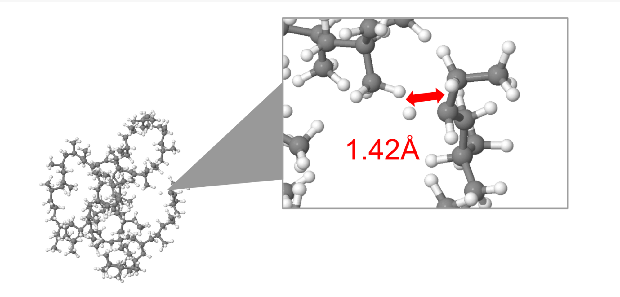 ルールベース手法のスナップショットごとの正答率が低下した原因を調べると、MDデータセット内のC-H結合の結合長が伸びた場合に結合次数の推定が失敗していることがわかりました。赤で示したC-H結合の結合長は\(\scriptsize 1.42\ \mathrm{Å}\)であり、ルールベース手法のC-H結合の閾値である\(\scriptsize 1.39\ \mathrm{Å}\)より長くなっていました。このような場合、ルールベース手法では閾値以上の結合長を持つ結合を認識できないことが原因であると考えられます。GNNベース手法でも同様にトレーニングデータに含まれている構造との差異が大きいために結合推定に失敗していると考えています。