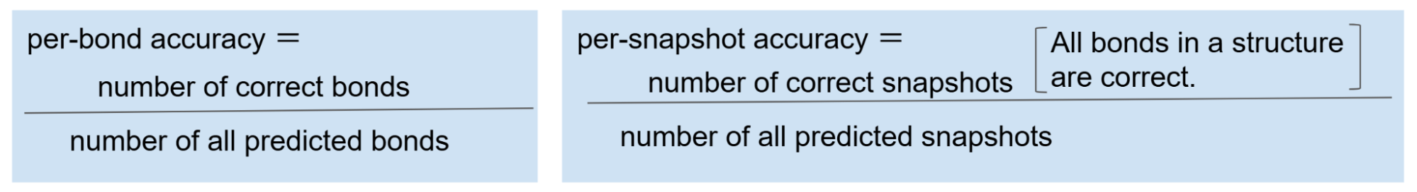 本研究では結合次数の推定精度の評価として、結合ごとの正答率 (per-bond accuracy) とスナップショットごとの正答率 (per-snapshot accuracy) を評価しました。正解したスナップショットは「構造中のすべての結合が正しく推定されたスナップショット」と定義されました。液体構造内の結合は10000本以上存在することから、スナップショットごとの正答率は結合ごとの正答率に比べてかなり厳しい指標となります。実際に古典MDへ切り替える際にはすべての結合を正確に決定できている必要があるため、スナップショット単位で結合推定できていることが重要です。それぞれの正答率は以下の式で計算されました。