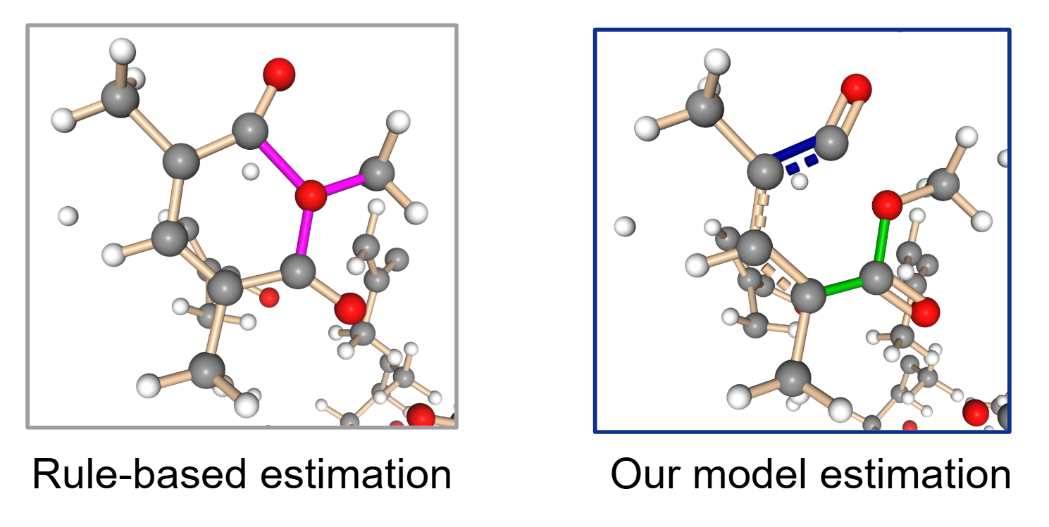 ここでは実用的なタスクとして、結合の解離形成が行われるような構造に対して適用しました。具体的にはポリメタクリル酸メチル (PMMA) の分解反応のMDトラジェクトリについて、ルールベース手法と本研究モデルの両方を適用した結果を示します。