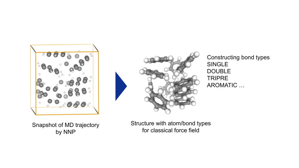 しかし、重合反応シミュレーション (PFP+反応加速MD) から物性評価シミュレーション (古典ポテンシャルMD) に移る際に課題があります。