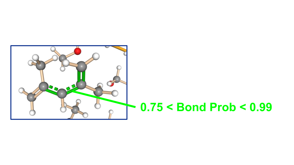 高分子MDトラジェクトリの内、ルールベース手法で結合の推定に失敗した構造に本研究モデルを適用した結果を示します。この図では推定された結合次数の確率が99%以上のものは通常の色で、75~99%のものを緑、75%以下のものを青で示しています。ルールベース手法ではマゼンタで示した部分の酸素の価数が3となっているのに対して、本研究モデルでは酸素の価数が2となっており、価数に従った結合推定となっています。この分子自体が高分子が分解する過程に生じるラジカル分子であるため、分子全体の価数が満たされている結果を得ることはできません。しかし本研究モデルの推定結果 (右) はできるだけ化学的に辻褄が合うような構造を出力していることが分かります。また推定の信頼度に対応して酸素原子の周辺の推定確率が低下していることが分かります。