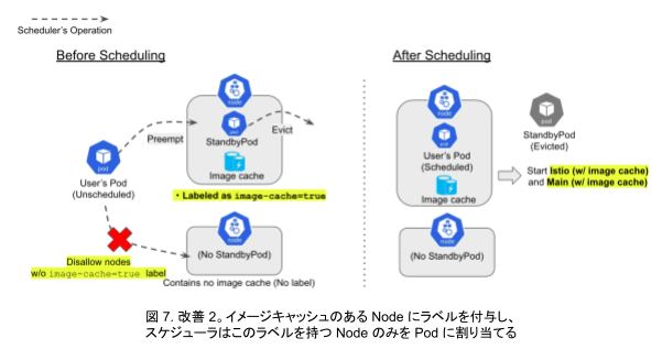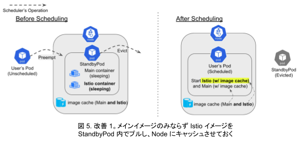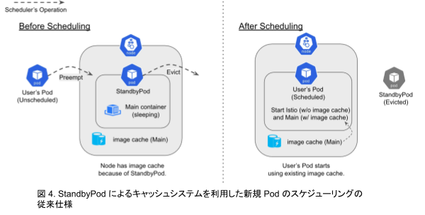 このシステムでは、あらかじめ用意した Node 上に準備用の Pod (StandbyPod) を立て、そこにメインイメージからなるコンテナをスリープ状態で置いておきます(この時、Node にはメインイメージのキャッシュが保存されます)。そして、ユーザーから実際に Pod 作成をリクエストされた際には、スケジューラが優先度に基づくプリエンプションを起こし、StandbyPod を退避させてこの Node を割り当てます。Node はイメージキャッシュを保持しているため、素早くユーザー用の Pod を起動できます。