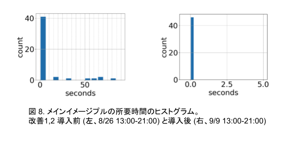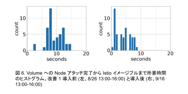 実際、Kubernetes のイベントログから算出した Volume が Node にアタッチされてから Istio イメージのプル完了までの所要時間のヒストグラムは、図 6 のようになり、平均 8 秒程度の時間短縮に寄与しました。