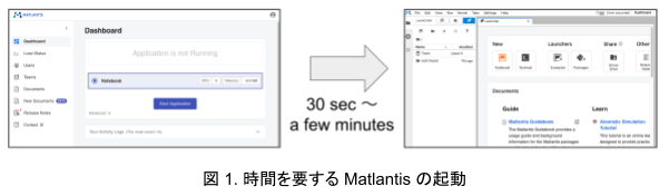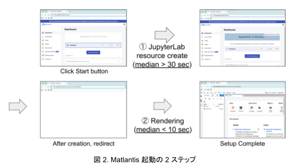Matlantis の Web アプリの抱える課題の一つとして、立ち上げに時間がかかるという点がありました。具体的には、ユーザーがダッシュボード上でスタートボタンをクリックしてから JupyterLab が表示されて利用可能になるまでに 30 秒 ~ 数分程度の時間を要しており、場合によっては大きくユーザー体験に影響するケースがありました。そこで本インターンでは、この起動時間を短縮するパフォーマンス改善に取り組みました。