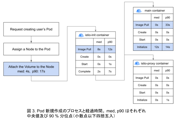 そこで、まずこのリソース作成のプロセスを細分化して分析しました。ここでのリソース作成の主な処理は Kubernetes クラスター内での Pod 作成です。Kubernetes のイベントログからこの各ステップの所要時間を集計したところ、Pod の Node へのスケジュールから初期化完了までの一連のプロセスの中で、幾つかのボトルネックが見つかりました(図 3)。