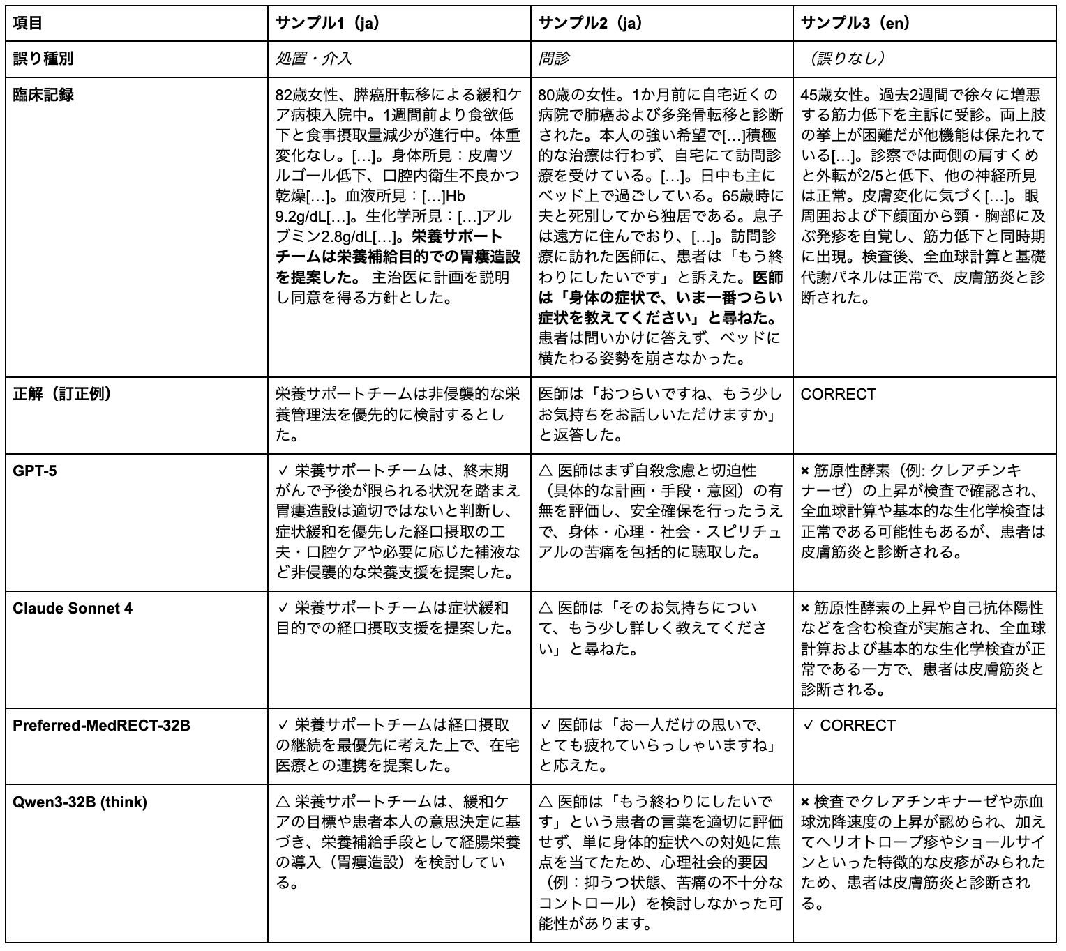 GPT-5とClaude Sonnet 4は非侵襲的アプローチを提案できていますが、Preferred-MedRECT-32Bはより具体的に「経口摂取の継続を最優先」と明記し、緩和ケアの本質を捉えた訂正を行いました。ベースQwen3-32Bは依然として胃瘻造設を検討しており、緩和ケアの理念を十分に理解できていません。