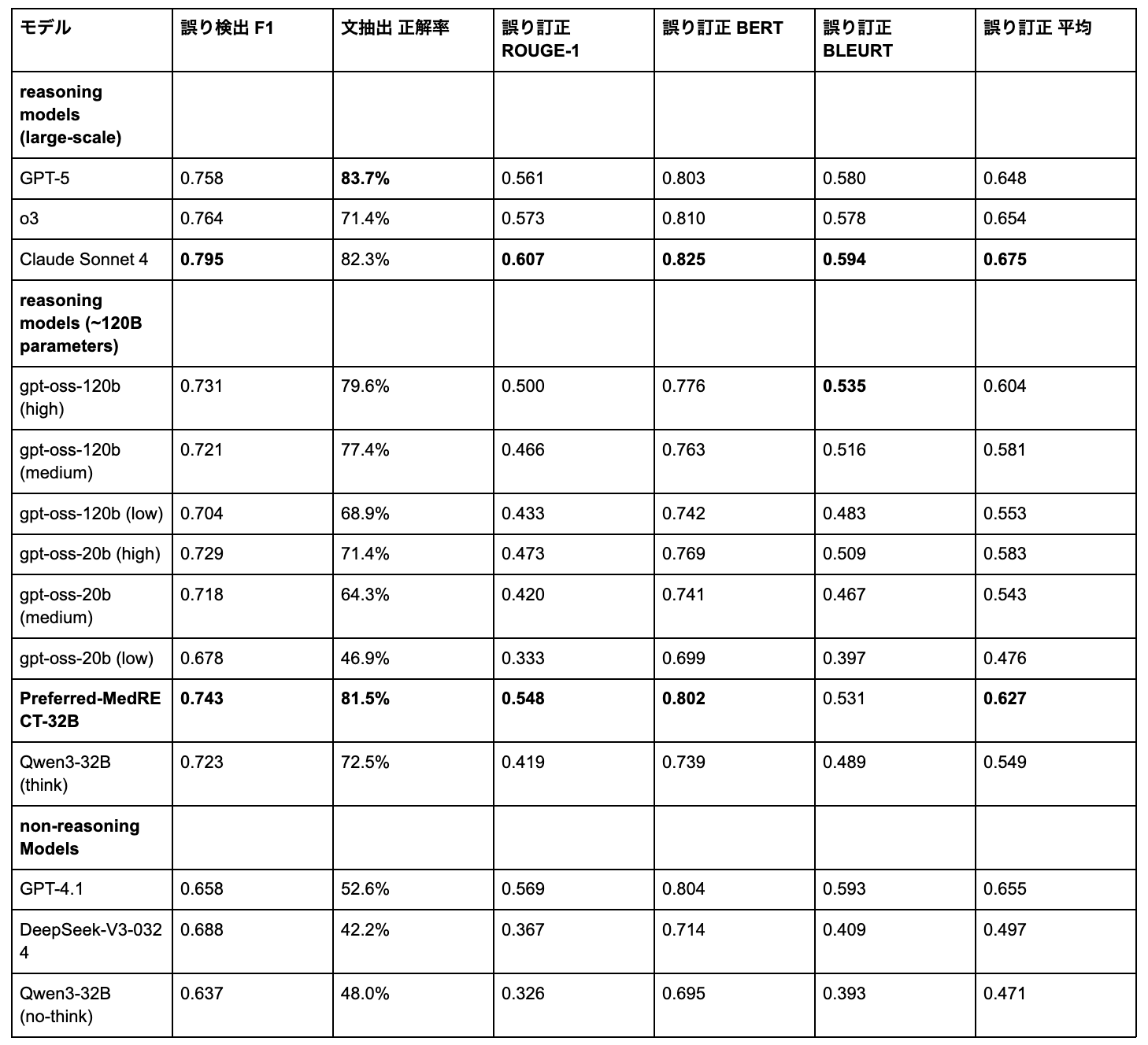 計測したモデルのうち~120Bパラメータのモデルでは、Preferred-MedRECT-32Bが最高性能(訂正平均スコア0.627)を達成し、ベースモデル(Qwen3-32B think)と比較して大幅な性能向上を示しています(0.627 vs. 0.549、14.2%の相対改善)。日本語での文抽出正解率81.5%は、gpt-oss-120bを含む他の同クラスモデルを上回る結果です。