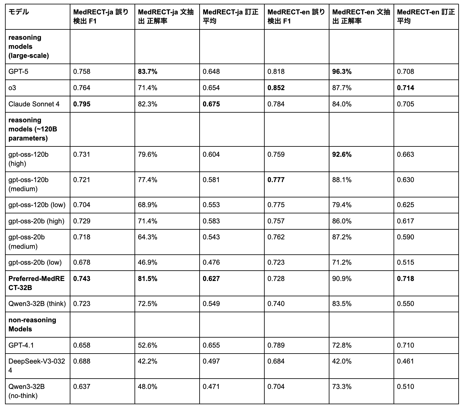 - reasoningモデル:GPT-5[17]、o3[18]、Claude Sonnet 4[19]、gpt-oss-120b/20b[20]、Qwen3-32B(think)[16]、Preferred-MedRECT-32B