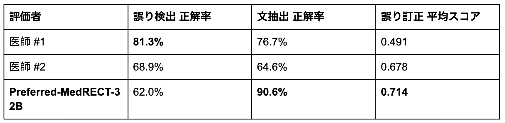 - 私たちの開発したPreferred-MedRECT-32Bは、先行研究の医師2人のスコアと比較して誤りを含む文の抽出・訂正で優れた性能を示しました。