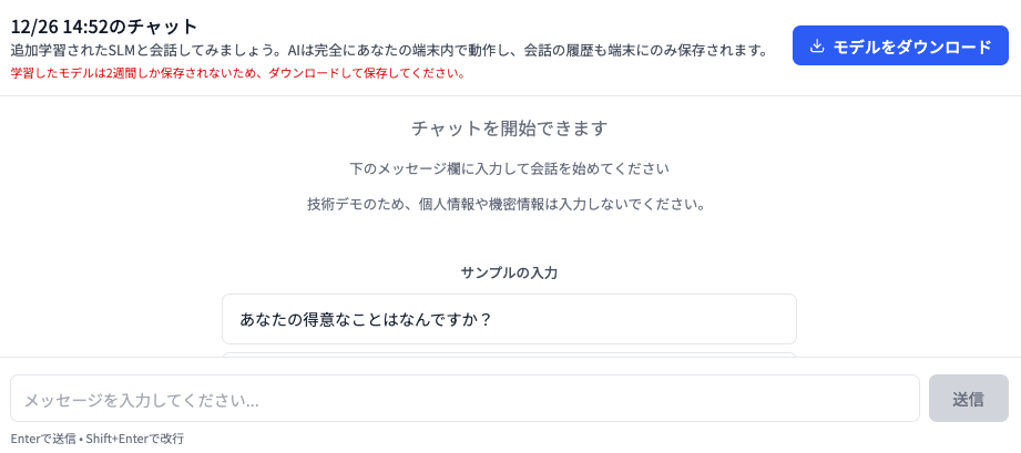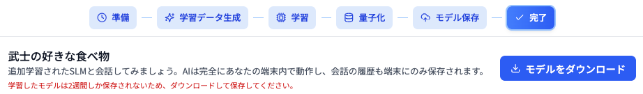 これを押すと、量子化を施す前の、学習直後のモデルをhuggingface形式でダウンロードすることができます。これをお手持ちのPC上で動かすことで、どこにも入力を送信することなく、カスタマイズしたモデルと会話することができます。