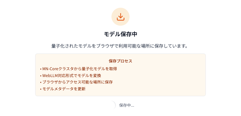 量子化されたモデルは、お使いのブラウザ上でWebLLMを使って実行できる形式に変換されます。続いて、自動的に「モデル保存中」という以下の図13のような画面が出ますので、しばしお待ちください。