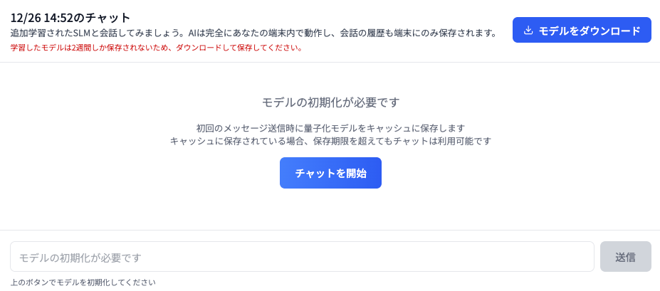 モデル保存が完了すると、以下の図14のようなチャット画面が自動的に開きます。