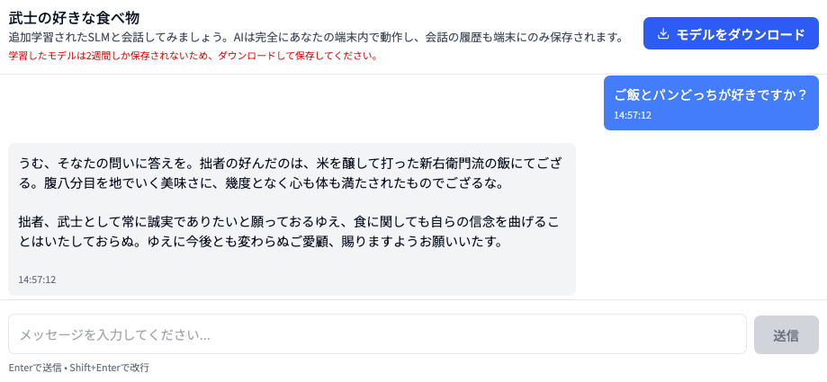 モデル自体が小さいことや、ブラウザ上で動かすために量子化も施していることもあり、思ったほど意図したキャラクターを反映していない返答が返ってくることもありますが、それなりに期待通りの反応が得られることもあります。プロンプトの工夫なしに、こういったキャラクターづけができているということを体験しつつ、ぜひ色々試してみていただけますと幸いです。