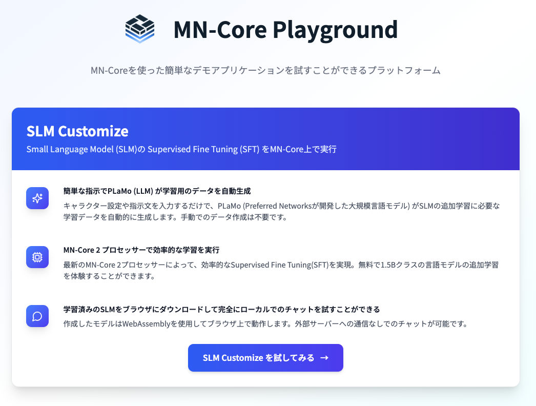 そこで、この度、多くの人に小さな言語モデル(Small Language Model; SLM)に新しく対話を学習させてカスタマイズしたモデルを作り、それを気軽にブラウザ上で実行したり、ダウンロードして色々な方法で楽しむことができるようなWebサービス「SLM Customize ( https://playground.mn-core.com/slm-customize )」をリリースしました。