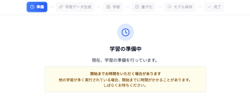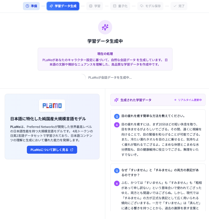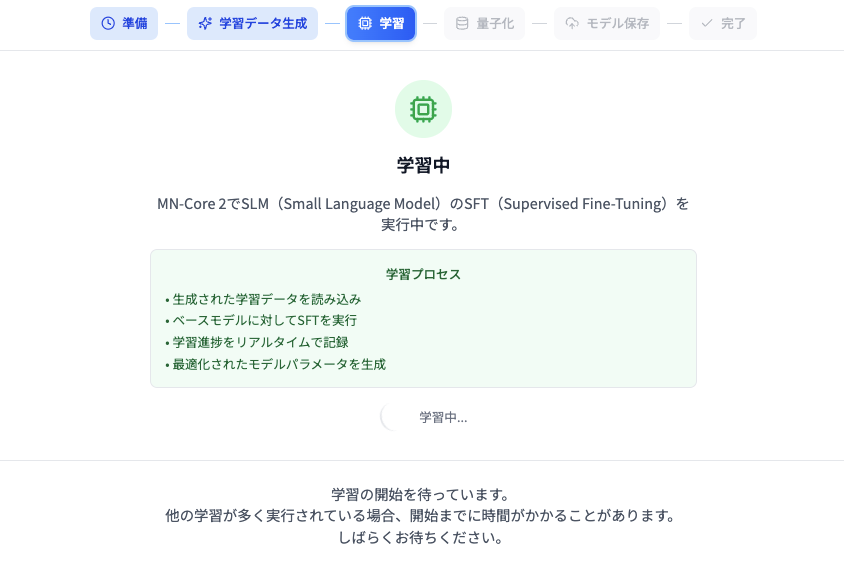 PLaMoによる対話データの生成が完了すると、自動的に以下図9のような「学習中」という画面になります。