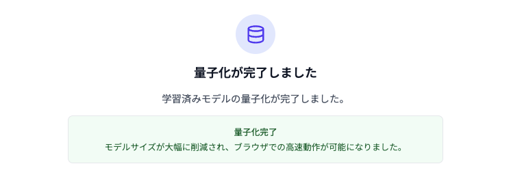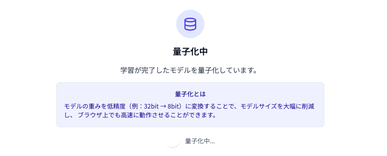 学習が完了すると、図11のような画面に自動的に遷移し、モデルの量子化(ある程度精度を犠牲にしつつ軽量にする方法の一つ)が自動的に実行されます。
