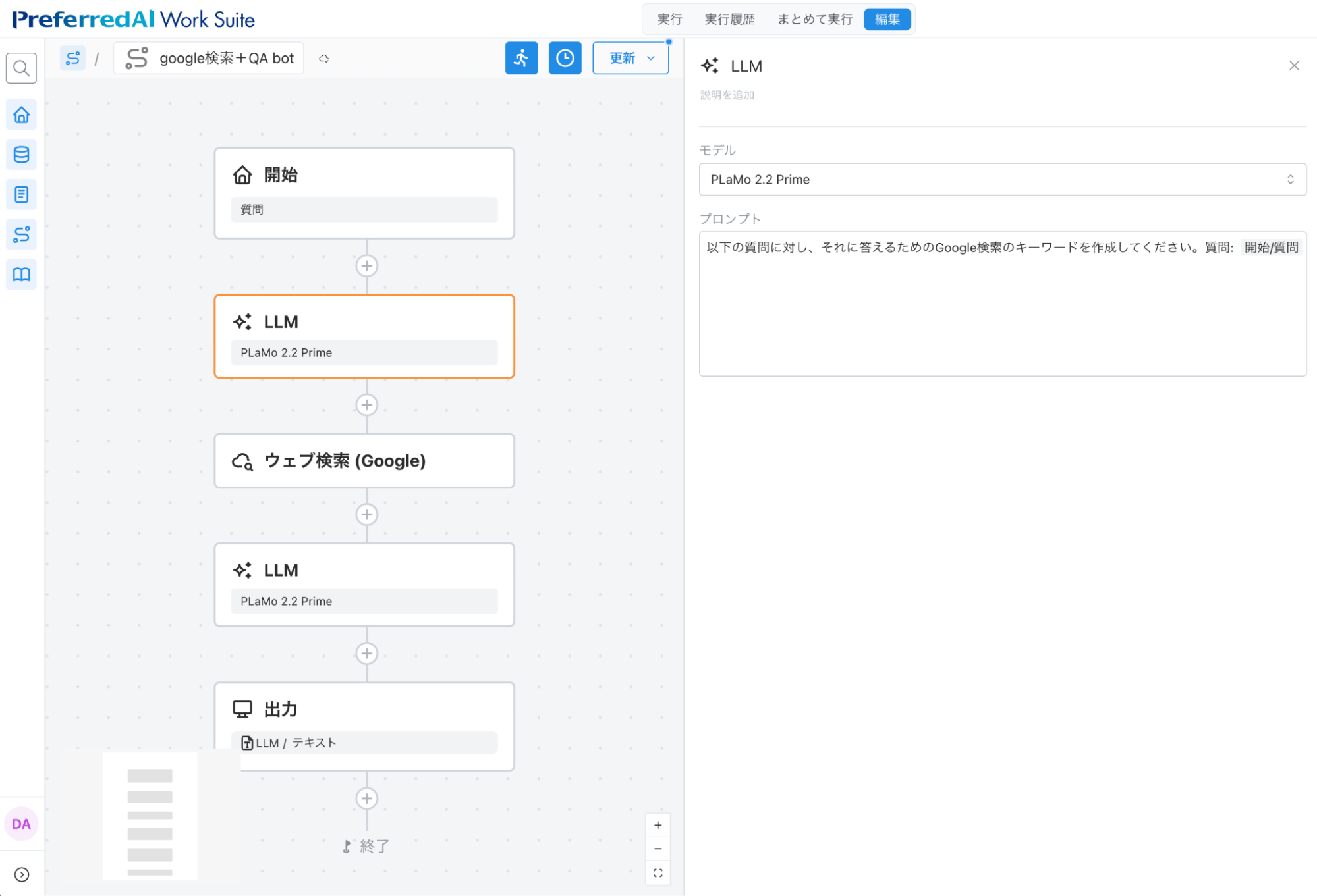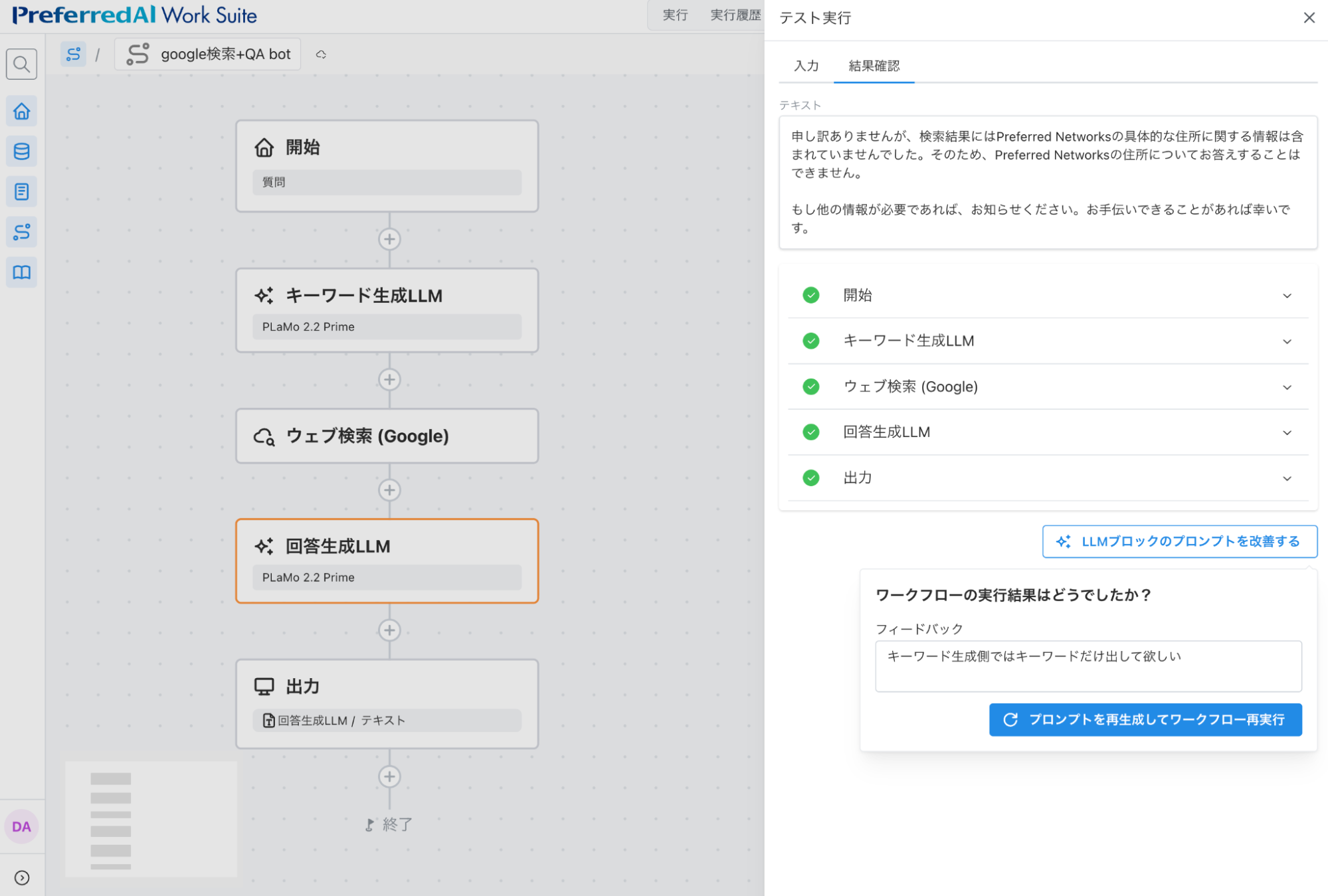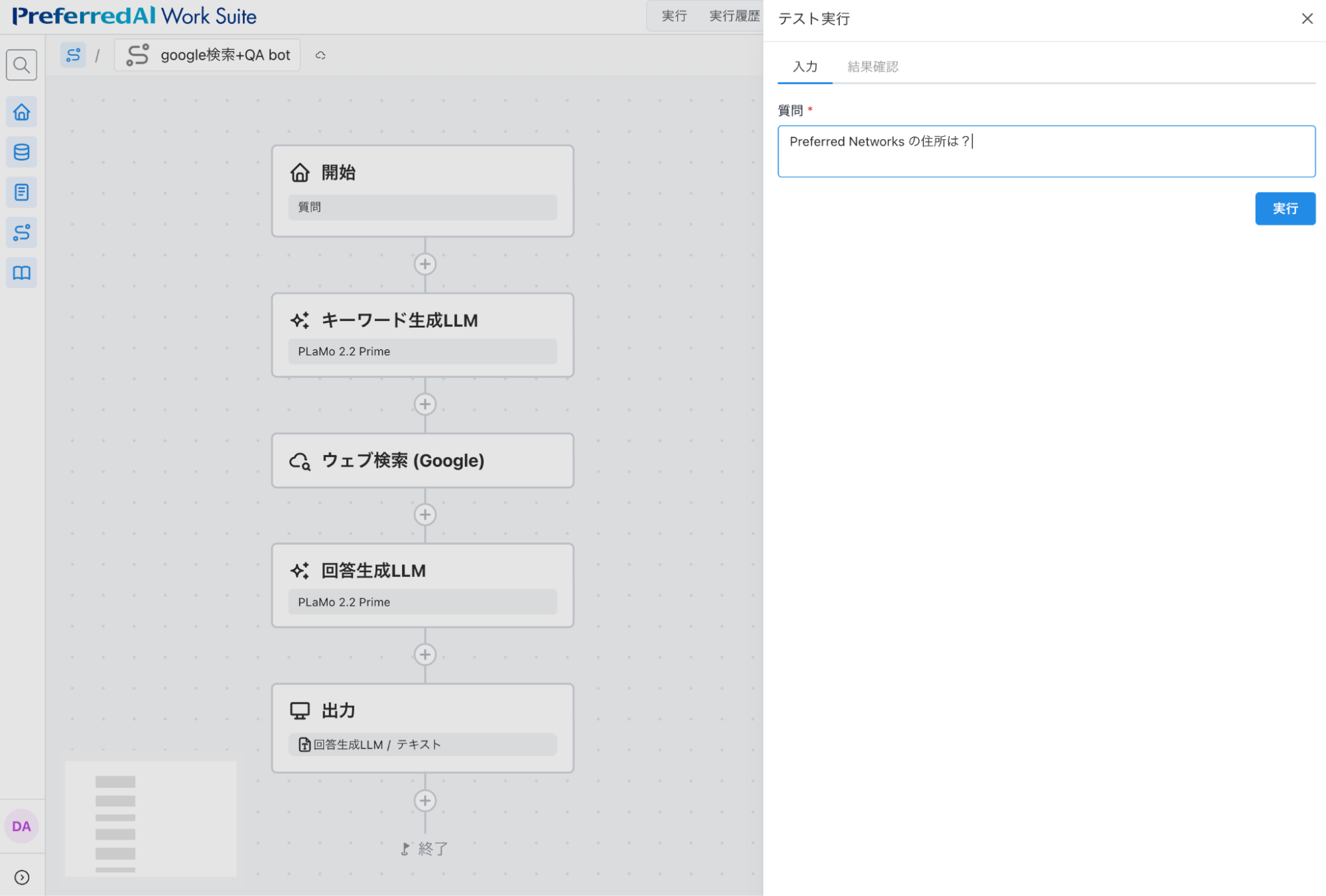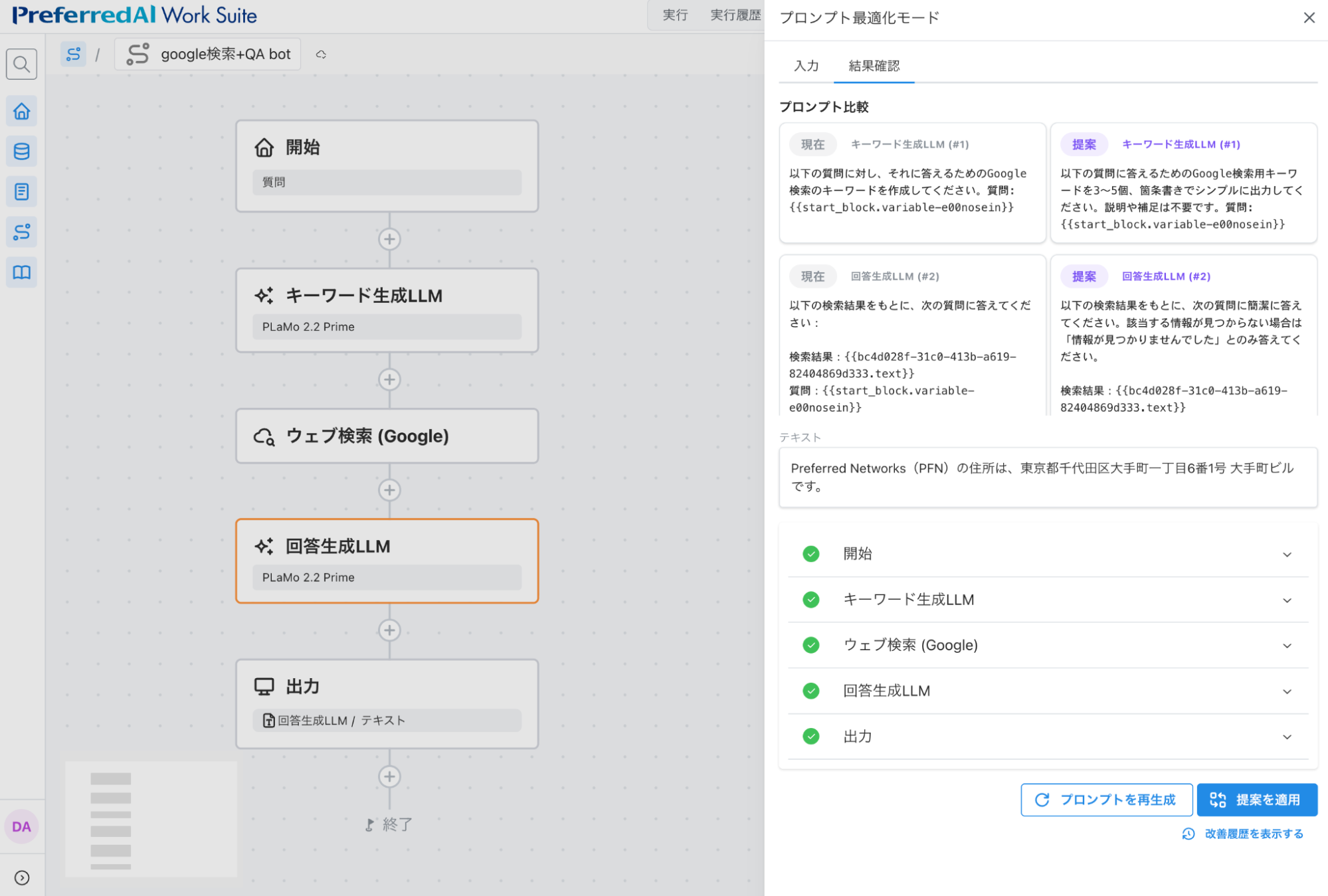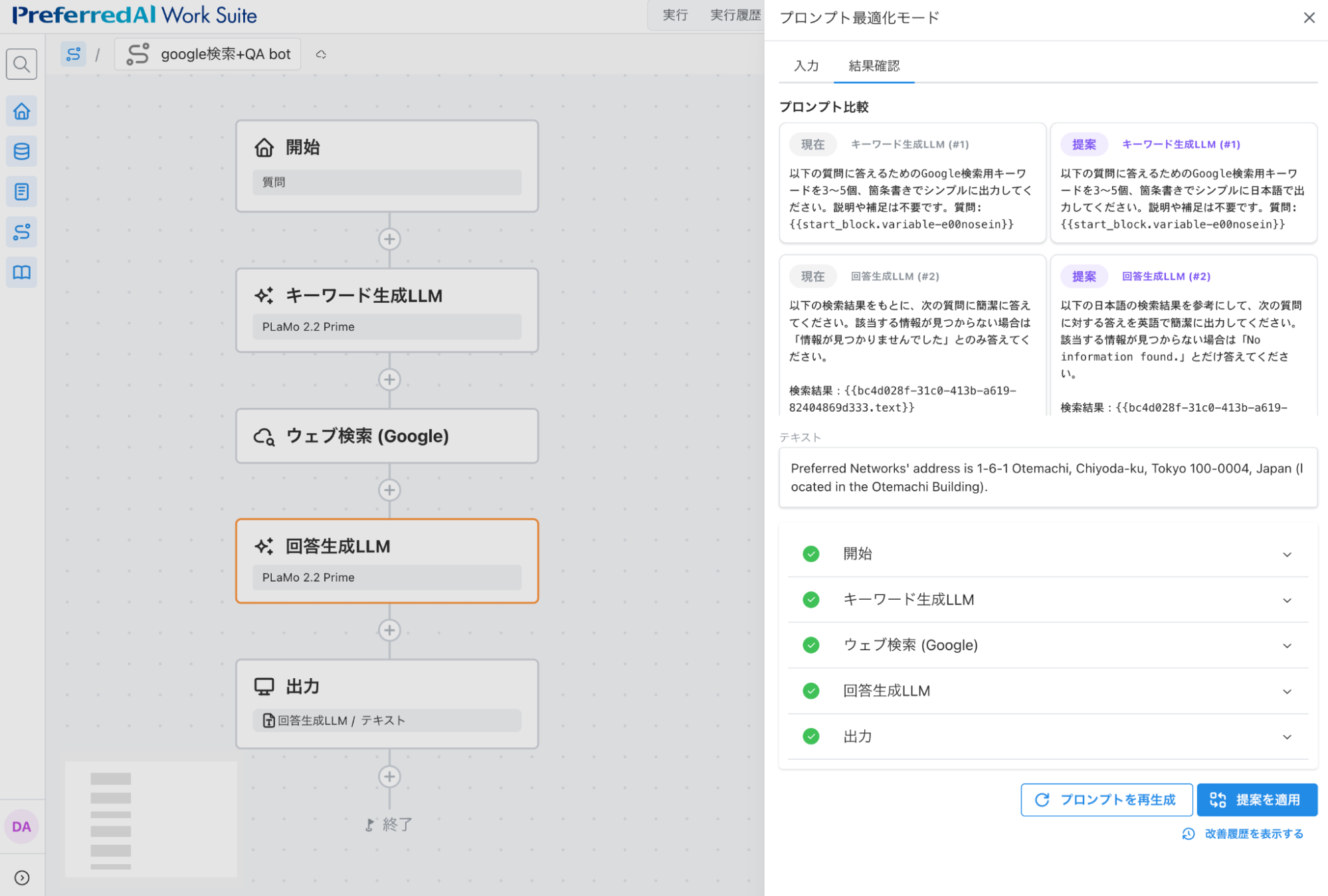 実際のプロンプト最適化の様子を、Work Suiteの画面上で説明します。ここでも、「与えられた質問に対し、必要な情報をWeb検索し、その情報をもとに回答を生成する」ワークフローを説明の例として用います。「Preferred Networks の住所は?」という入力を質問とします。