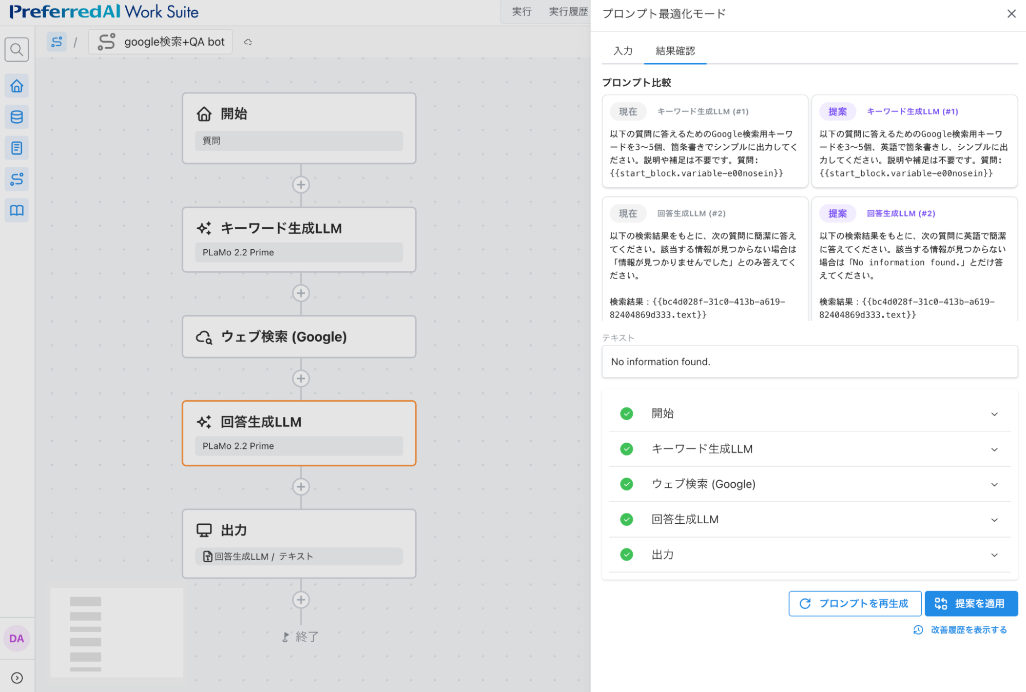 キーワード生成LLMのプロンプトに、キーワードのみを出力する旨が追加されています。また、回答生成LLMの方では、今回のフィードバックは関係なかったものと判断され、(一般的な改善を施す微修正は入ったものの) とくに大きな変更はありません。このように、フィードバックの内容に応じて、本質的に変えるべき部分はどこなのかを自動で判断して、プロンプトが最適化されていきます。「提案を適用」ボタンを押し、変更を適用します (左側ボタン「プロンプトを再生成」を押すこと、右側ボタン「提案を適用」を押すことが、それぞれ、アルゴリズムにおける reject / accept に対応しています) 。