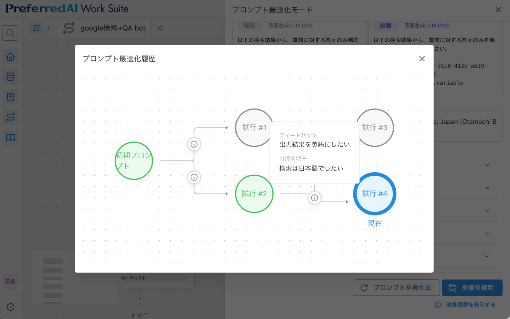 また、プロンプトの最適化の履歴は、ツリー形式でみることができるようになっています: