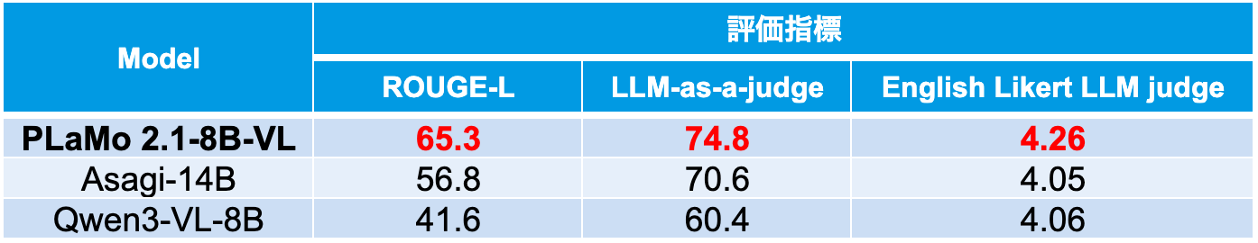 - 最新のオープンモデルの中で、PLaMo 2.1-8B-VLと同程度のモデルサイズにおいて最も性能が高いQwen3-VL-8B