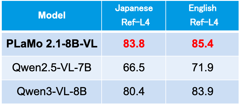英語・日本語それぞれのRef-L4において、PLaMo 2.1-8B-VLはQwen2.5-VL-7B、および、Qwen3-VL-8Bを上回るスコアを達成しました(表2)。
