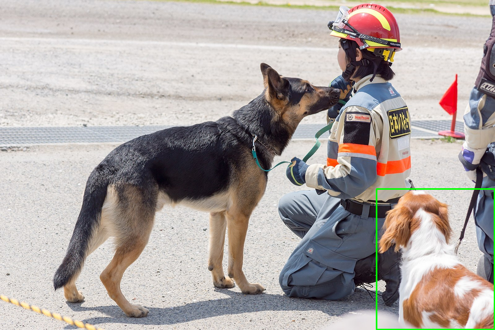 写真:lasta29「Search and rescue dog, Japan Rescue Association」、 出典:Wikimedia Commons、 ライセンス:Creative Commons Attribution 2.0 Generic(CC BY 2.0, https://creativecommons.org/licenses/by/2.0/)、 URL:https://commons.wikimedia.org/wiki/File:Search_and_rescue_dog,_Japan_Rescue_Association_(34690315563).jpg、 ※本記事での掲載にあたり、バウンディングボックスの追加加工を行っています。